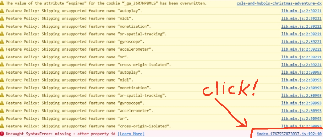(Also, those warnings about Feature Policies are probably benign. lib.min.js is itch's code. I don't know what it's doing. I get similar warnings in Chrome.)