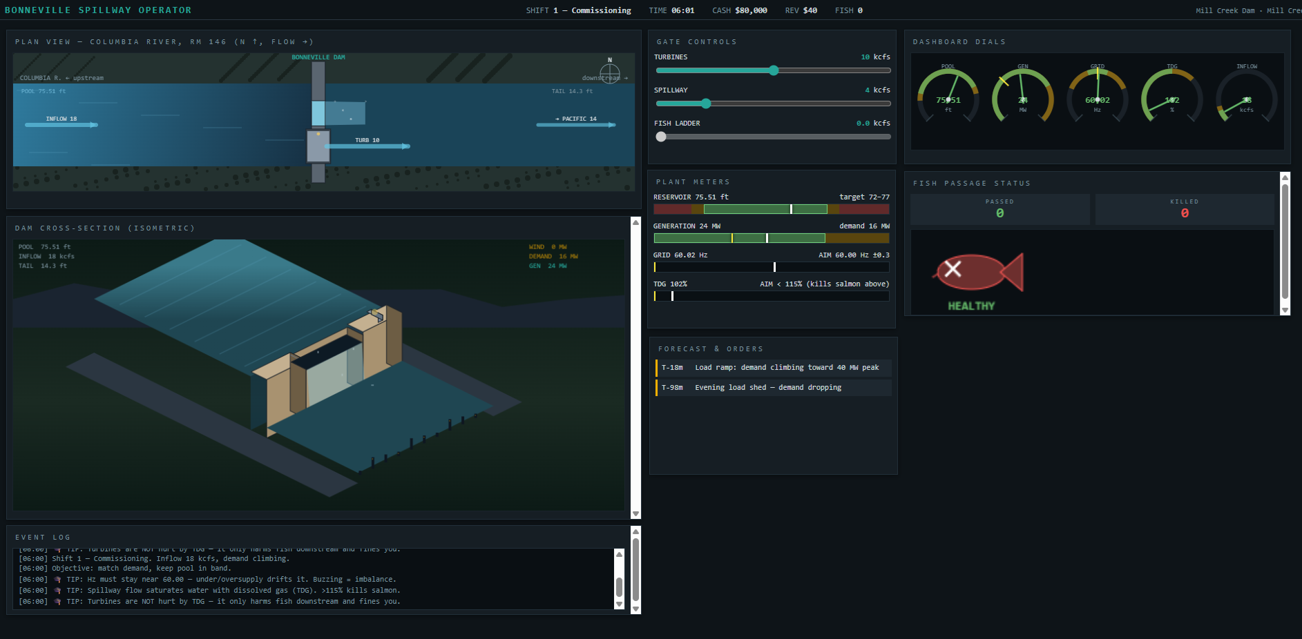 Hydro Operator by HydroEngineer - You take control of the Bonneville Dam (or some others) and balance the needs of fish, electricity consumers, your equipment, and farmers.