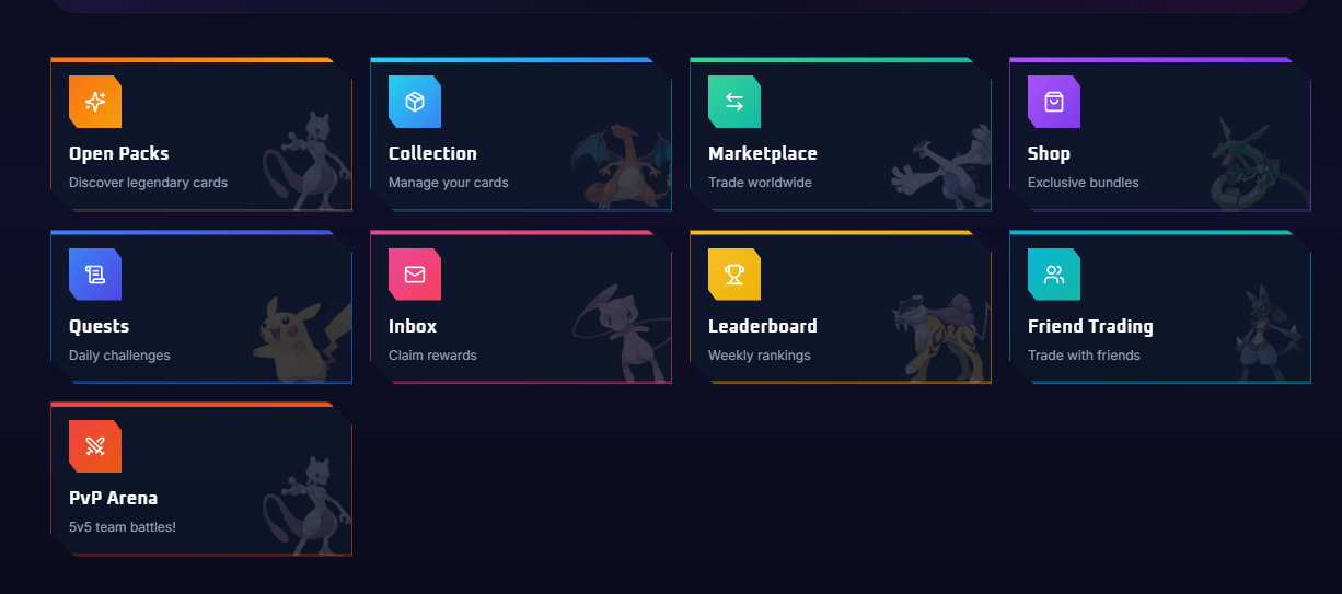 Pokemon Pack based game, open packs, collect, sell to market to other player, upgrade pokemons, pvp battles and more...