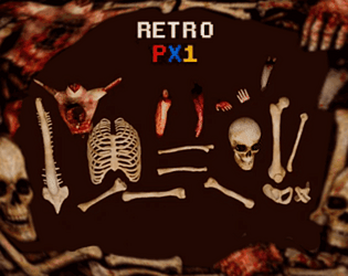 Retro pixel props of bones, skulls and raw flesh for dark games.