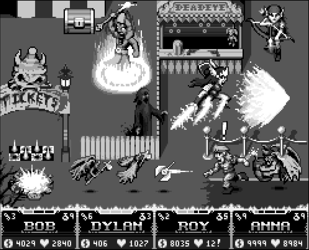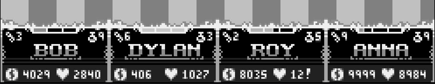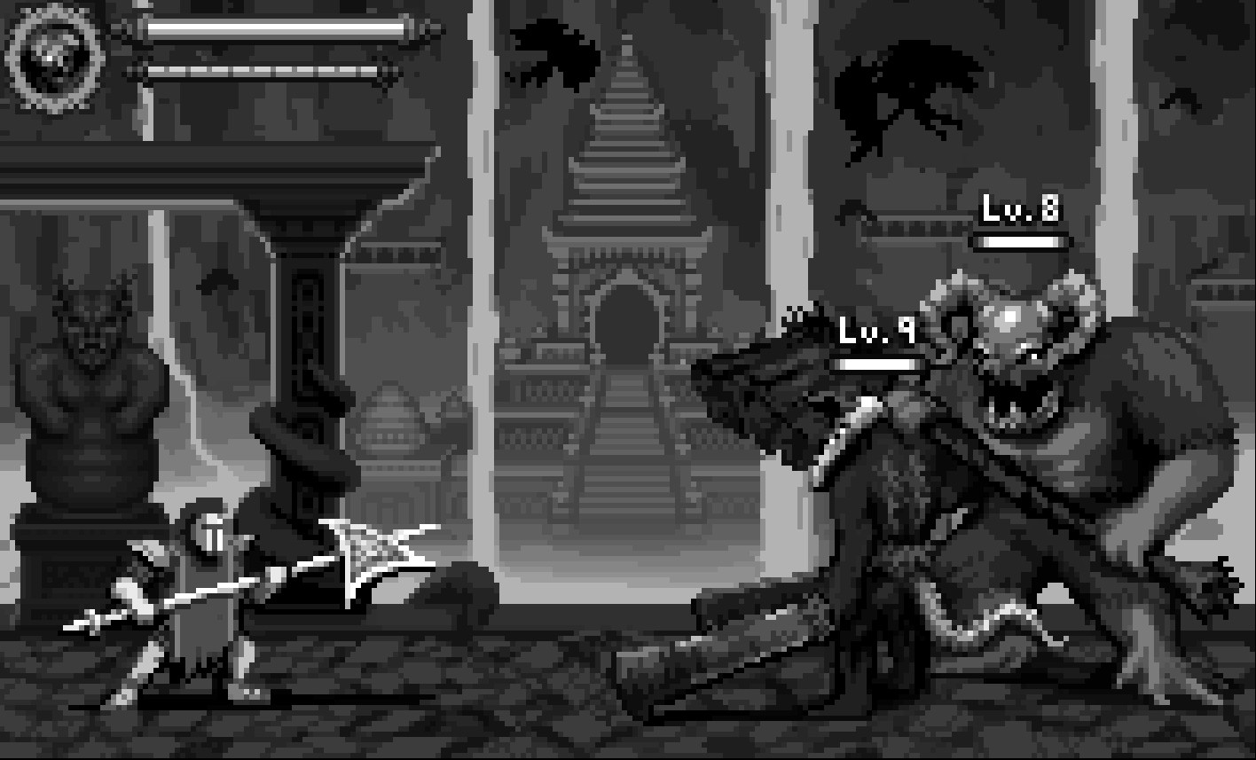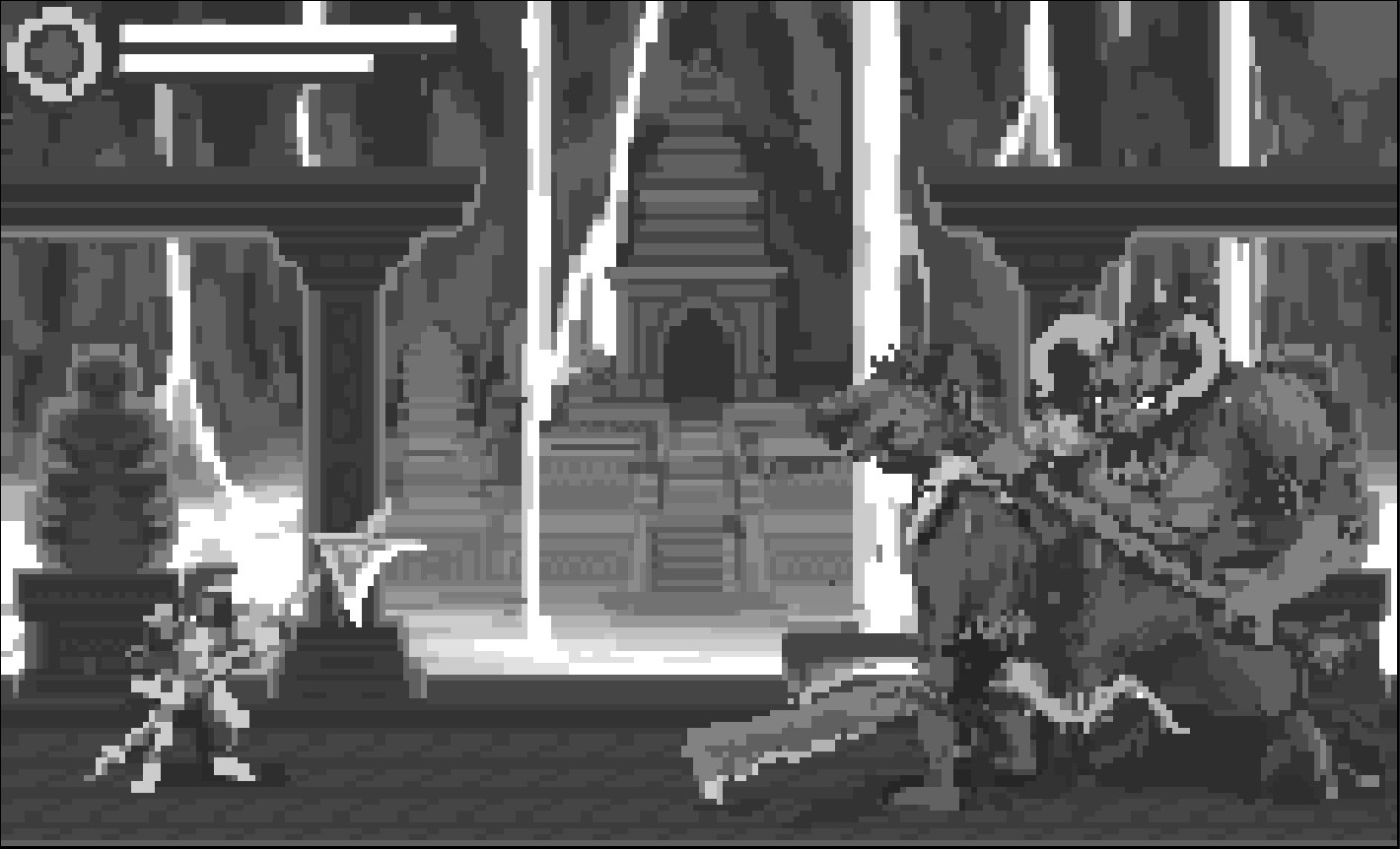 Once you get here and decide it's good enough to start coloring, well then there's nothing to do but color. But I don't start by just manually picking and drawing in all the colors for every single pixel in the screen, and neither do I mess around with the grayscale layer(s). I keep the grayscale stuff locked as just shading reference. Instead in Aseprite, I create a new layer or 2 and set their mode to "overlay", and usually set their opacities to about 50% so that the colors aren't too opaque. These layers allow you to just pick and paint simple base colors over the image and you don't have to re-shade manually anything. For example, grass -> green, wood -> brown, metal -> gray, gold -> yellowish orange, rocks -> gray, brown, red, skin -> brown, white, tan, pale, etc. My point is that you don't have to pick all the different shades of color. You just pick base colors and paint away. For example, with the Gauntlet UI elements, it starts grayscale: