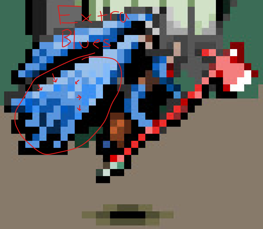 What I'll generally do is take the magic wand tool, set the tolerance to about 10 (in Aseprite) and start selecting groups of pixels with colors that are too similar, then just reduce them to a few key colors or clusters instead. This will result in very distinct colors in the end and cause less strain on our eyes. The palette becomes much cleaner and simpler to look at.