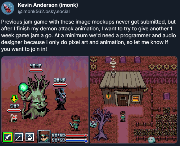 Hello. I'm a pixel artist who enjoys drawing and animating RPG monsters, more on the chibi JRPG side I guess but not always. I also draw environments occasionally but not as often. I'm looking for a jam team. The jam must give me at least 5 days to make the art assets though. Here's my portfolio.