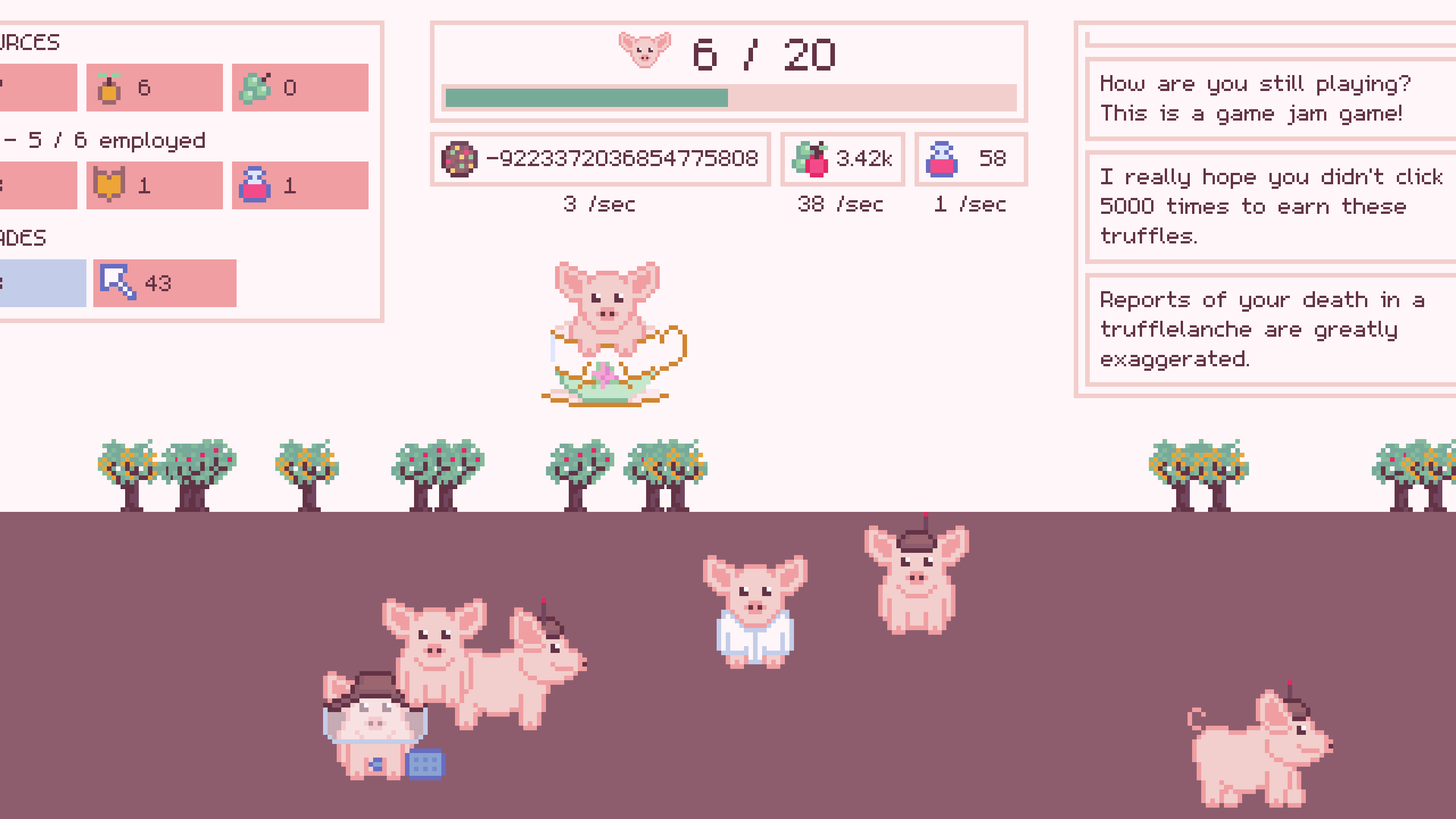 I do remember someone sending a message on the discord about putting a lab coat on a pig, and I guess I know who now. Pretty cool game, I love giving pigs jobs, and the art's great. A slight problem though, you can click on the "Better Clicking" upgrade as much as you want, picture is of me breaking the limits. Fun game though, good job!