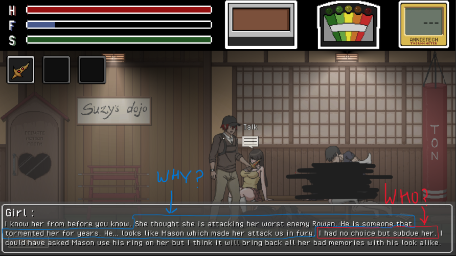 Will see about it once current projects are done so I will have plenty of time to think through everything. Stuff will not be random. You explore things and you find events. Those events will not go any where until you make some progress through it (with a few exceptions that affect main plot for example... getting the ring, helping Hailey to take down Mena, Hinata's quest). These quests from main plot will be visible in message app as they are available.