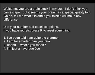 There is a setting a fair amount of the games I make take place in known as the Stellar Abyss which you can get some insight into through Future Museum. I should note Brain Box is not a Stellar Abyss game, even if it has a bit of its DNA in it. Exospace is absolutely a Stellar Abyss game, but that game is my flagship project so it has been mainly released in prototypes such as the Combat Prototype that may leave you with the impression it's going to be an arcade game. In truth it's an Adventure-type game with interactive story elements as I hope to eventually demonstrate with an NPC Prototype later this year. I publish these prototypes mainly since I want to have some public vertical slices to get feedback/exposure with.