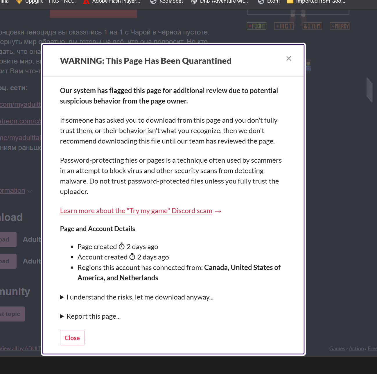 So basically you get this popup when you want to download it. From what I understand a staff kinda has to properly look at the game and remove the popup. But idk