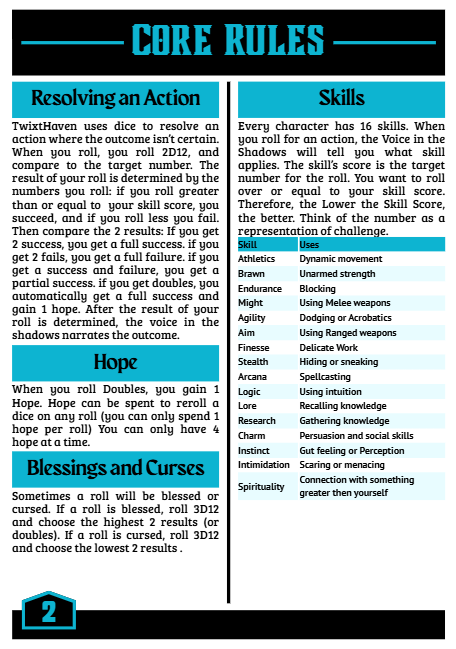 Twixthaven: a rules light ttrpg with a focus on player facing mechanics, simplified combat, and collaborative storytelling that uses a 2D12 resolution system where player's skills determine the difficulty class.