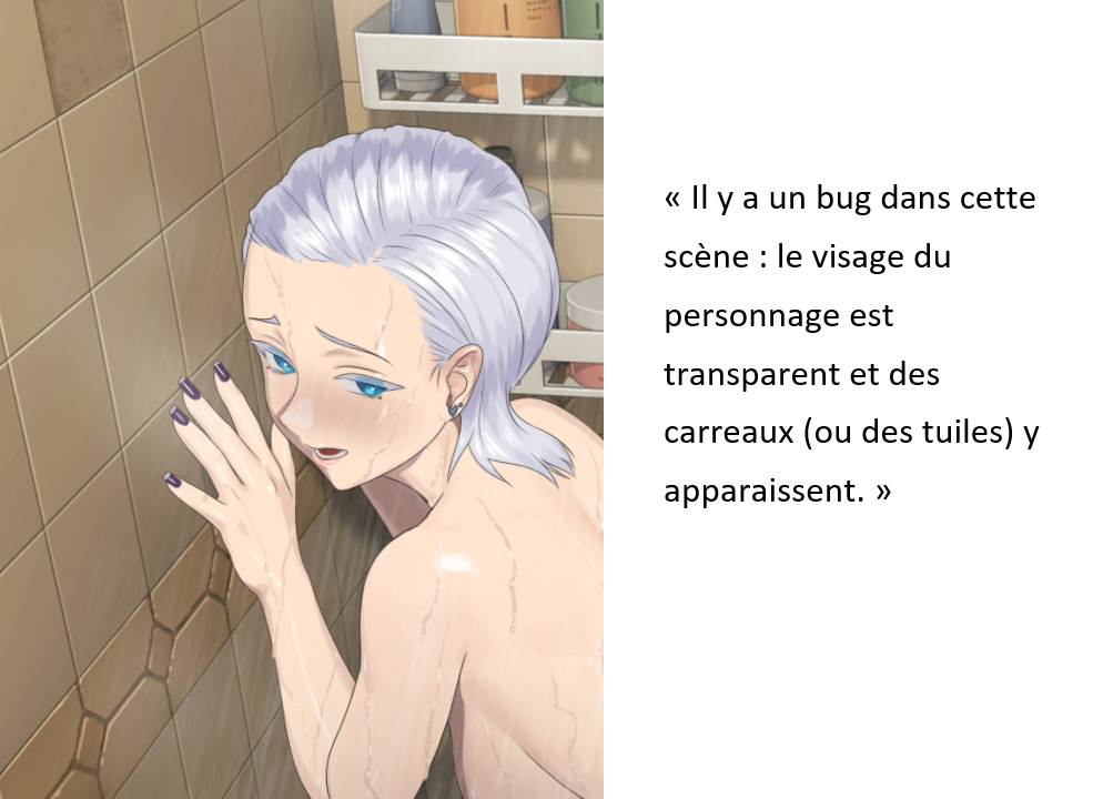 « Il y a un bug dans cette scène : le visage du personnage est transparent et des carreaux (ou des tuiles) y apparaissent. »