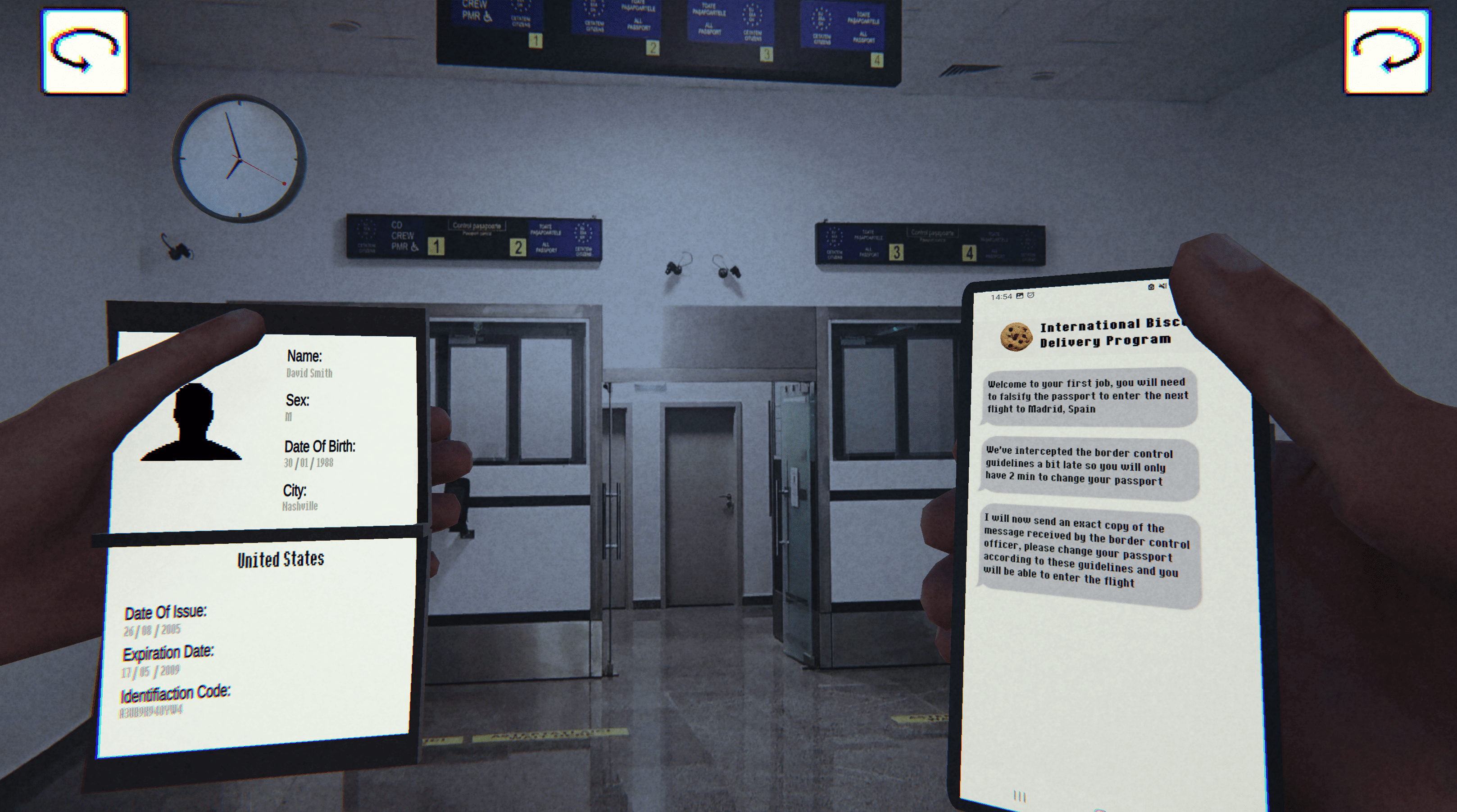 Hey, thanks a lot for your comment! The game was defenitly inspired by papers please but reverse. I agree with you that it's a bit too much time, I did that so the song would end the exact time because I didn't want to cut it off but that created the problem of having to wait too much time. In the story I though about giving more dialog to the guy who sees your passport but I didn't have any idea and I also didn't have much time. How would you develop more the story?