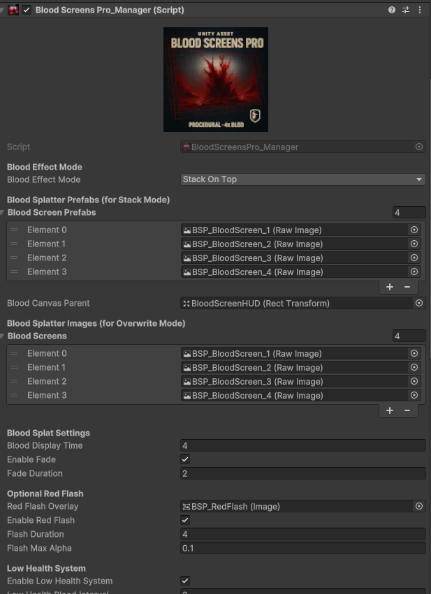 Hello! I just released my latest asset for unity, it offers a toolset to create procedural and non procedural blood stains on the screen, aswell as a low health system.