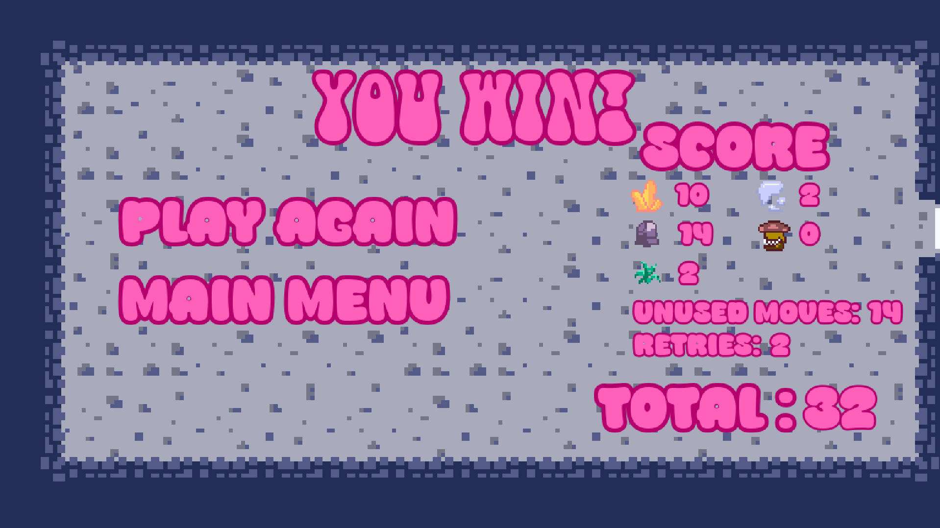 One of the first things that hit me was the creepy music. Was this intended to be a spooky game? I like having the consumable things be a resource- though the powerups that make you able to go 2-3 spaces in one go make the game REALLY easy. Before really figuring out what does what, I had already won, lol. Since the powerups are directional based, having the item you are about to eat be in the direction/shape of the powerup would make it a smidge more obvious (For example, making the shape of the crystal be an up-arrow shaped crystal). also passing through the mushrooms gives you an additional turn? took me till a second playthrough to realize this. Pretty neat puzzle game, would be awesome if new enemies got introduced