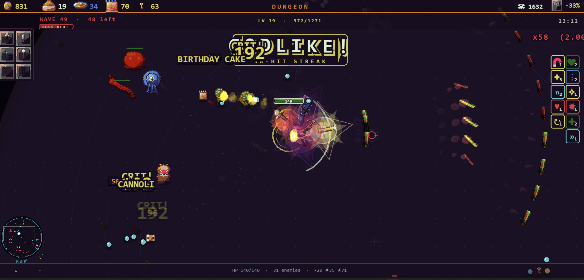 An endless pixel-art roguelite where pastries are the currency, bosses have signature mechanics, and your arsenal grows with every bakery trade.