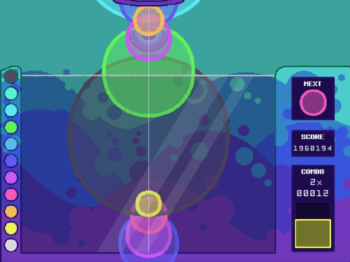 btw there's a pretty major exploit you can do where you can just not move the dropper, and keep hitting down, and all the bubbles just stack on top of each other infinitely without causing a game over. also as a side note to that, you cannot merge 2 of the largest size bubbles to get rid of them (like in suika game), so eventually, playing normally, you will run out of room.