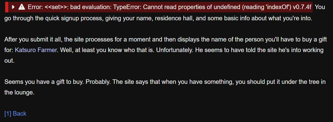 this was so cool! but i got this weird glitch thing during the true end that put a chatbox over my screen that was flipped and upside down. Took me a second to read it because it's upside down AND flipped, but it says "Even though I don't remember a single thing about that woman, I feel a shiver running down my back. I clutch the ends of my". Dunno what it's about, but I thought I should comment on it cause it seems unintentional and kind of keeps my screen black minus text and stuff.