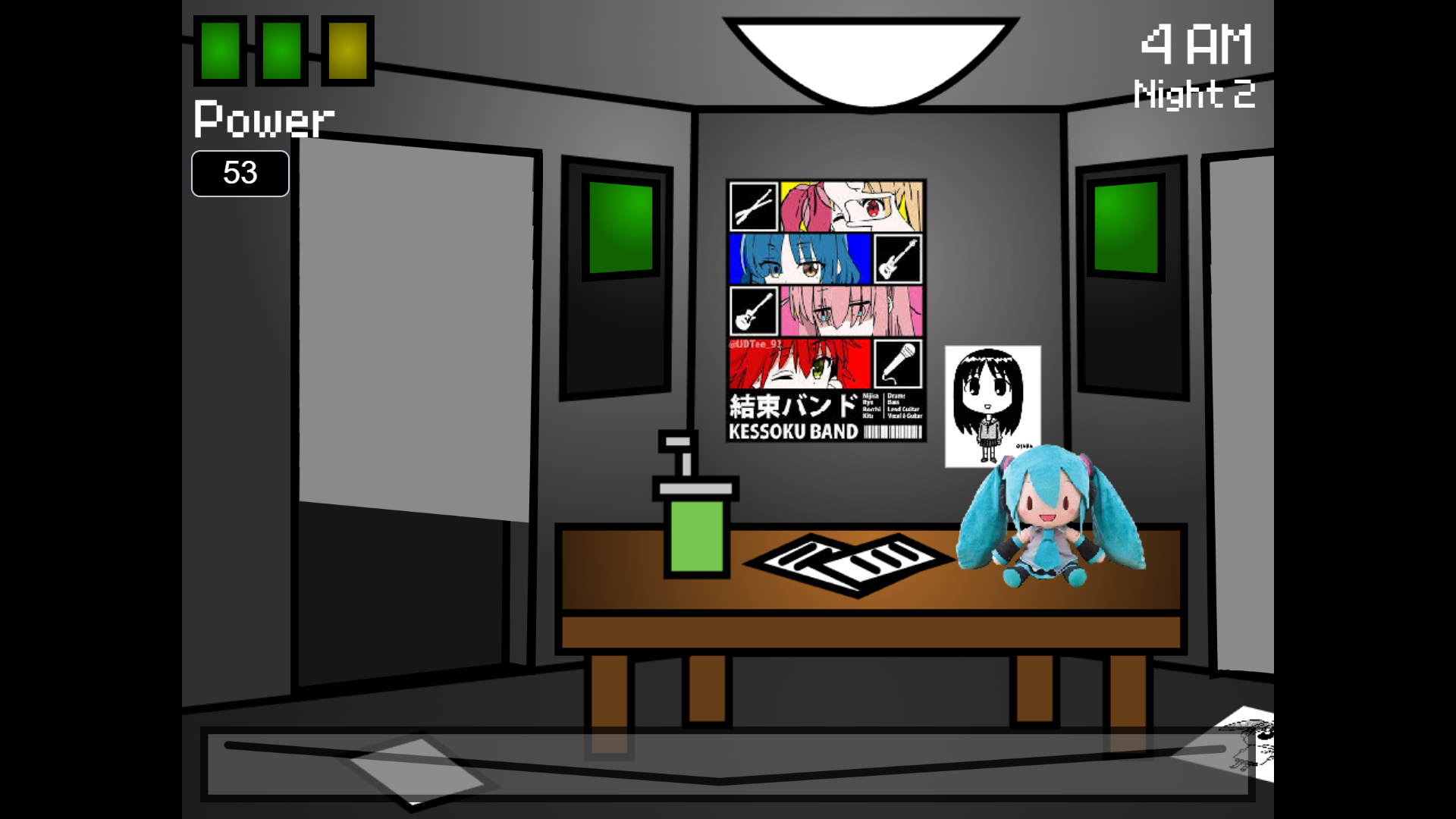 cool tbh the game is fun its normal yeah but there are Osaka in the game also miku and teto its realy cool i hoped when you click on miku she well make a sound like when you click on fnaf poster but yeah also idk why the door is like this sometimes but yeah it ok also i want to ask to give the game an option to download it not lust play it in the browser i have a friend who have a realy bad internit if you make it possible to download it i well be thankfull i think he really love to play it he is a big fan of auzmaka daho and fnaf so yeah hope you make it possible. sorry for bad english and this is my first time commenting on a game