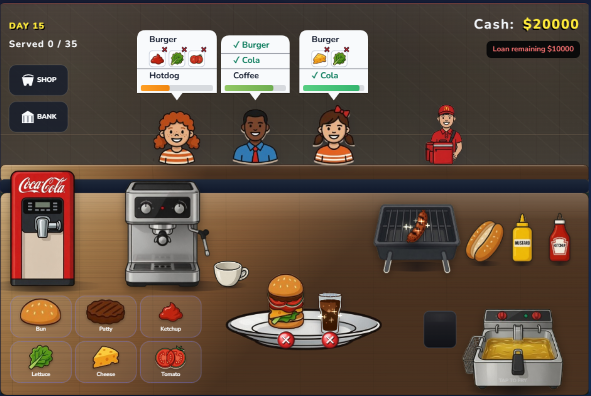 Line & Dine is a cooking diner game where you serve burgers 🍔, hotdogs 🌭, fries 🍟 and coffee ☕ to hungry customers . The catch is that you are in debt and you just have 30 days to pay off the loan. Can you do it? Find out here -