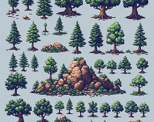 A detailed pixel art tree pack featuring a wide variety of forest trees in different shapes, sizes, and colors.