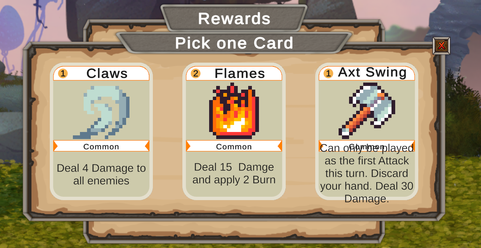 Hey there I just got done playing your game and i really liked it even if i don't play that many deck building games. I Must say it was fun. Firstly I have to say the main menu is gorgeous and i really like it with the perspective, colors and everything. I like the pixel art and realistic drawn BGs it looks good together.