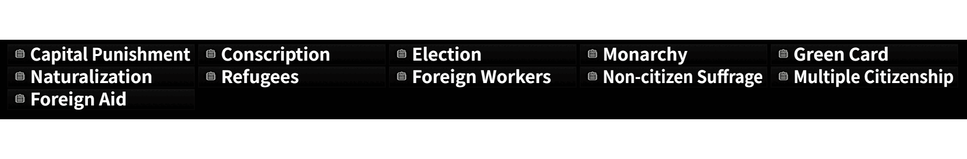 - Foreign policy, economy, welfare, criminal law, constitution, treaties, etc.