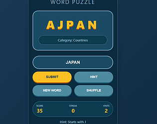 Complete word puzzle engine with multiple categories, hint system, and scoring mechanics.