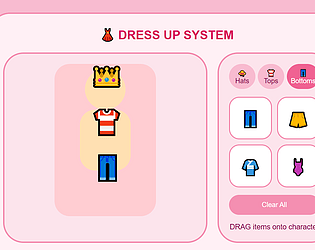 Complete dress-up game engine with drag & drop clothing, multiple categories, and save/load outfits.