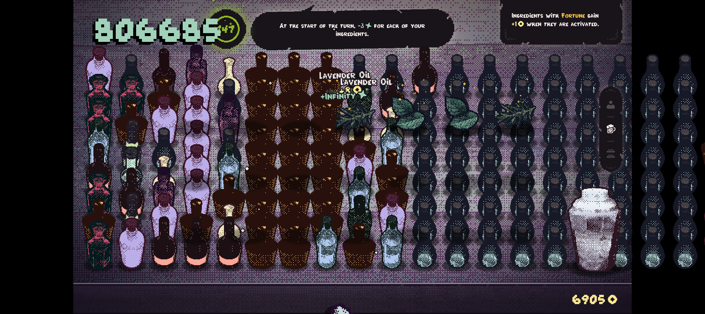 Now, sell all but the most echoing “duplicate the last ingredient” plants, and then buy a “duplicate the last potion” (rosemary). Then make sure your last purchased potion is “add echo to a random ingredient at start of round”. Within one more round, you can get many copies of rosemary with increasing numbers of echo activations attached, and get a massive number of bottles of one of the potions that add echo.