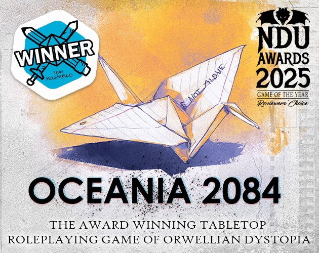I am very happy to share some remarkable news. Oceania 2084 has been awarded No Dice Unrolled’s Reviewer’s Choice Game of the Year as well as Best Setting. Receiving this recognition for a game that explores dystopia, resistance, and the importance of human connection means more to me than I can fully express.