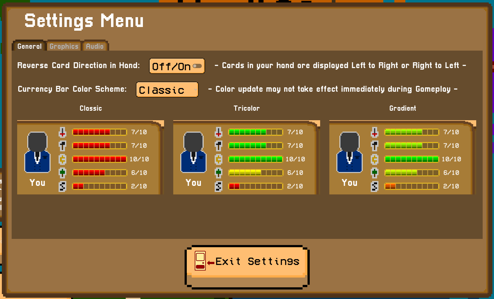 - Changed the Currency Bars' color scheme. The player can choose, in the Settings, one of three themes that change how the Currency Bar color changes during gameplay: