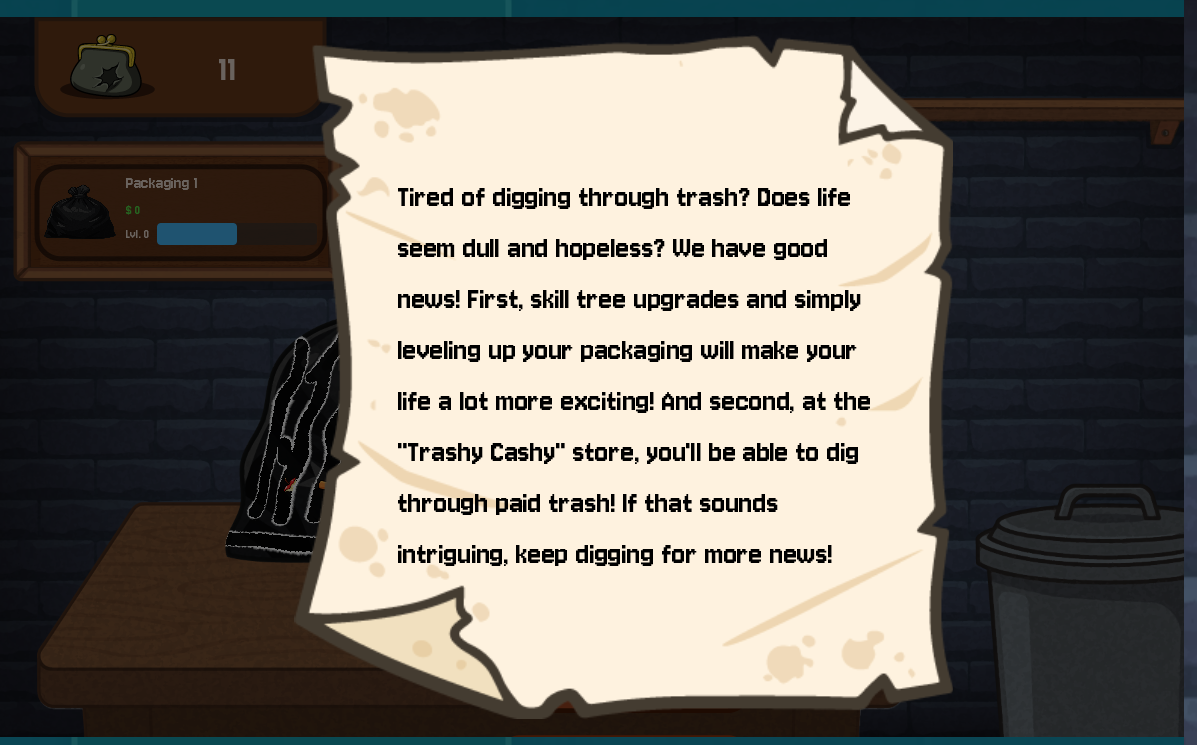 in the standard itch io window without the fullscreen. Its not said anywhere that fullscreen is required to play the game. And i mean the ui moves around with the resolution. The table scales, trashbin, that's why i got so confused. You're like 50% there.. Just the ui-elements do not scale. Not saying it absolutely needs to, but i think it would be a good feature to implement, as well as in future games. Many people may open this in a side window. Its a grindy game about digging trash for an hour, might as well people watch a movie in the side window while they are at it.