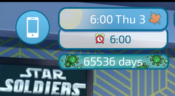 Then there is the matter of the virus/sickness sign at the top left corner as in the image below. When it first appeared it was at the change of season and showed only 2 days, but now it shows 65536 days. What is it about actually?
