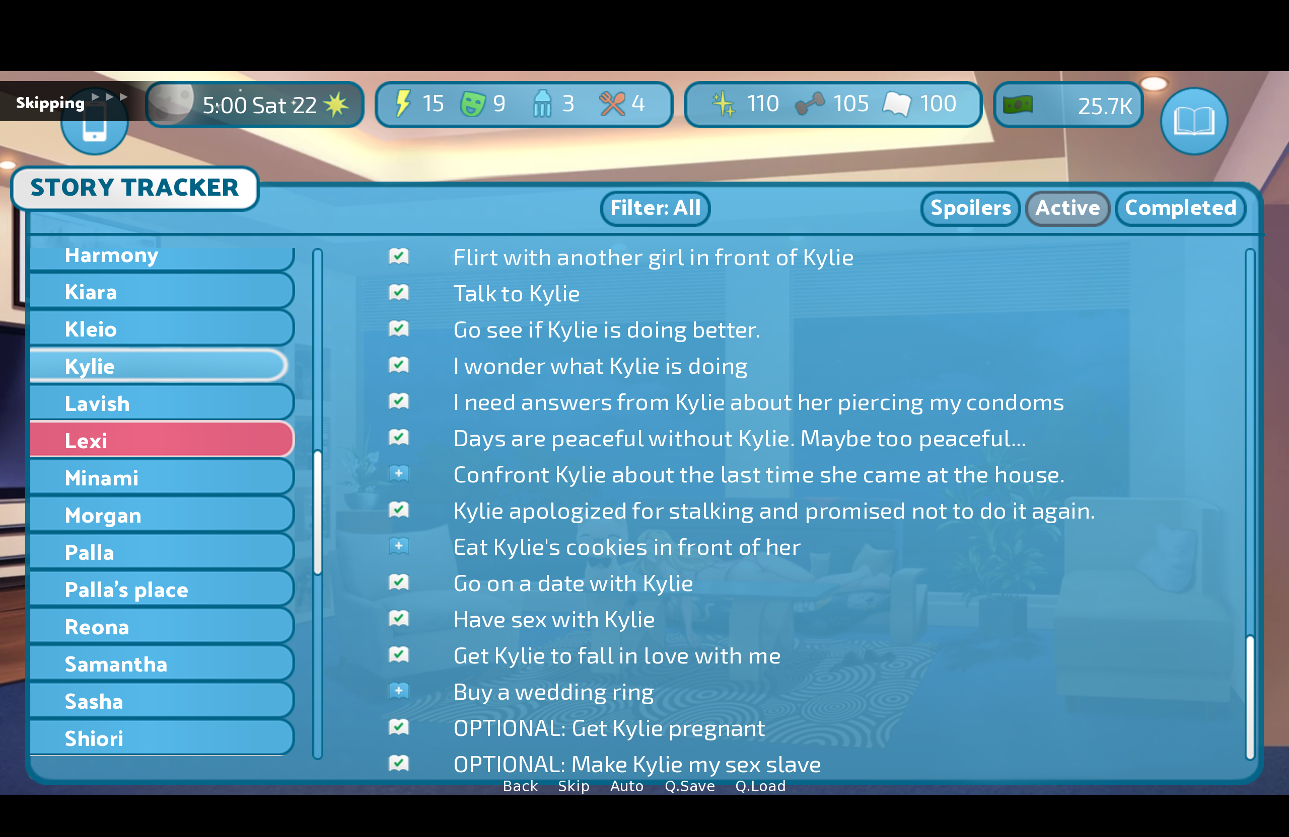 Love the game. Bought 2 of the DLC. In the latest update I believe there are a few bugs. While the sound one is already pointed out in one of the posts below. Just that in my case it is the sex sounds that distorted/warbled and happens in all the time. There is this one about being unable to trigger the "Kylie’s night assault" event. Below is the screenshot of her story tracker.