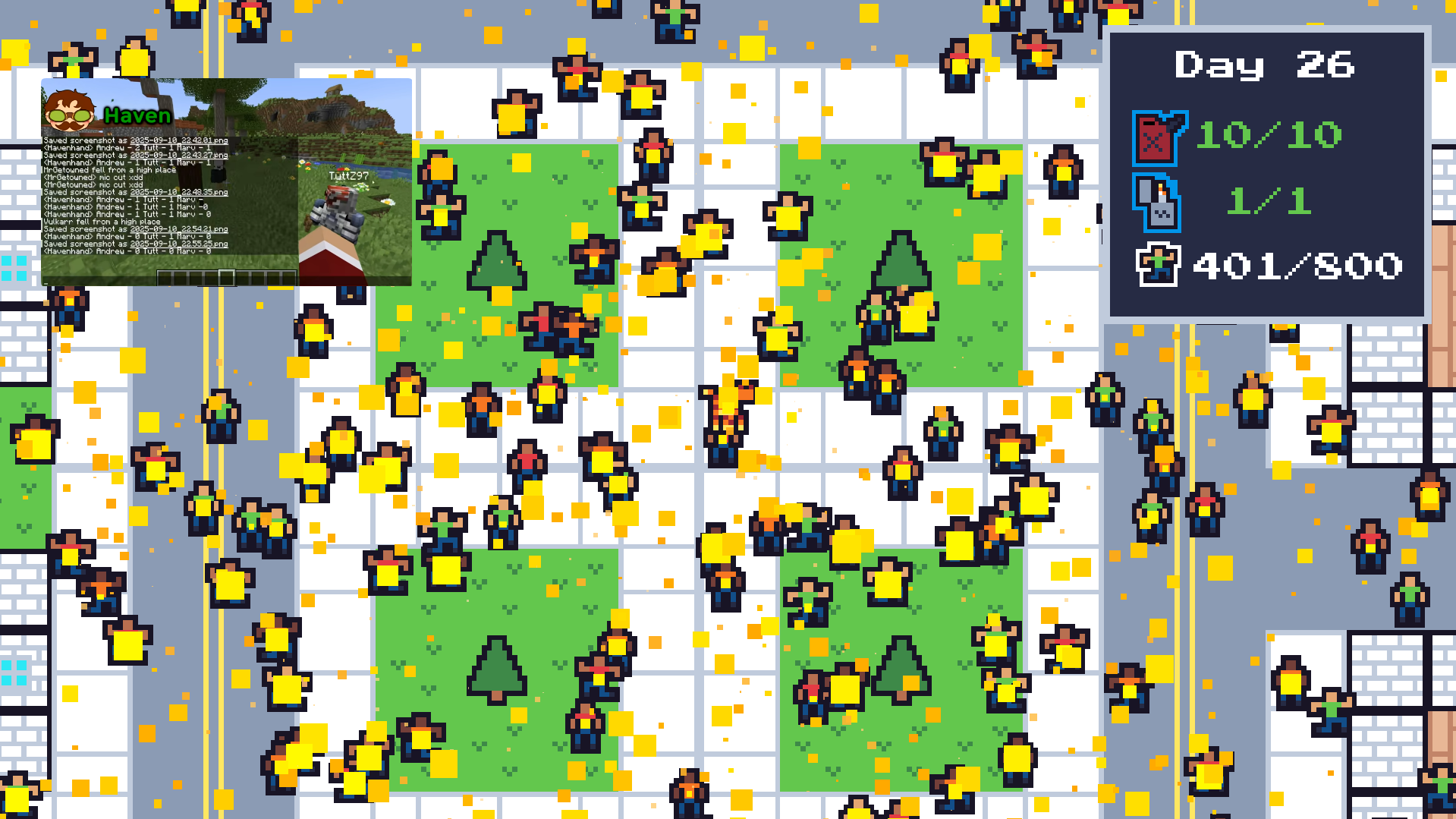 This one is super fun and chill! I do appreciate that you added in an endless mode. But sadly my computer called it quits when I made the population 800, 750 was fine, 800 was its limit, lol. Even had speed upgrades for me and the ppl, but I never bought the extend burn time since everyone died fast enough XP (I was also watching a Havenhand vid when this happened so that's why there is a random Minecraft in the pic lol X3 )