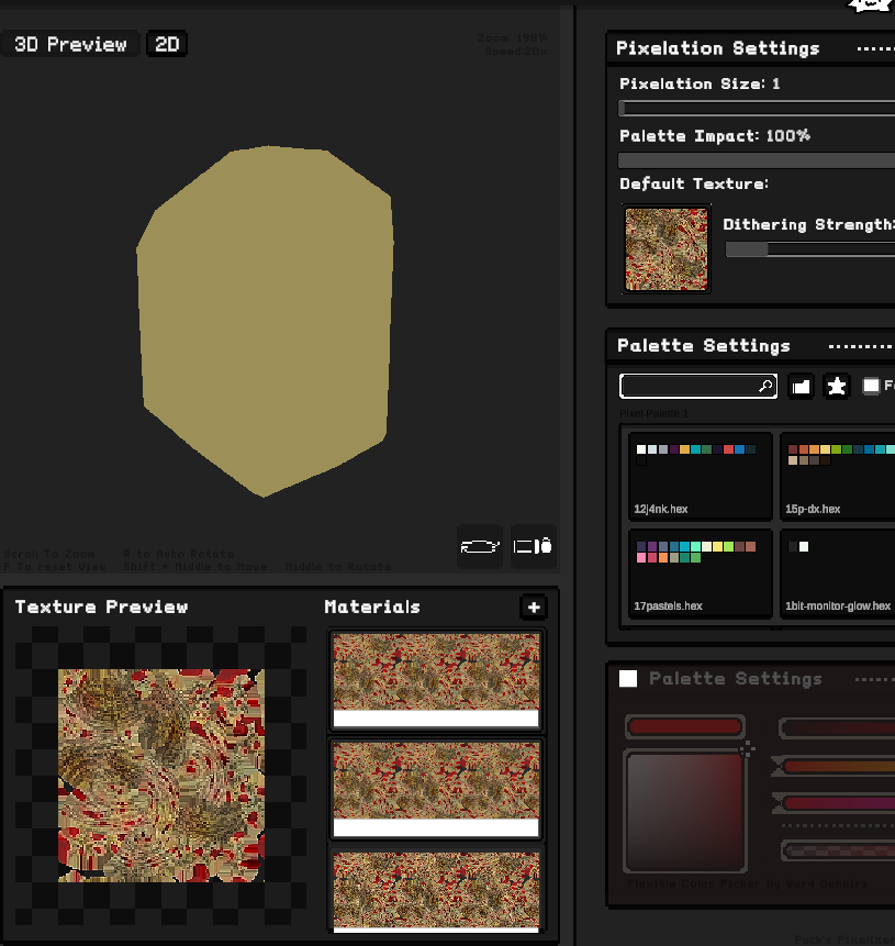 Everything works except it doesn't load my texture correctly on model. No matter what I change it just shows the model as a solid color. Adding palettes and changing settings still works on the texture and I can export so it's still useable but would be nice to see it in the preview. Hitting apply or using auto apply doesn't do anything to help. I'm using fbx files on windows 11 and version 1.11