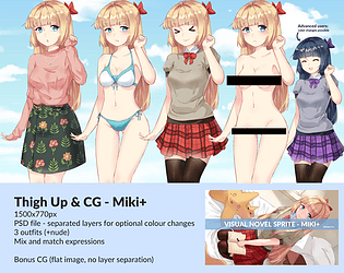 A thigh up PSD sprite with multi expressions, 3 outfits + nude. Includes bonus CG.