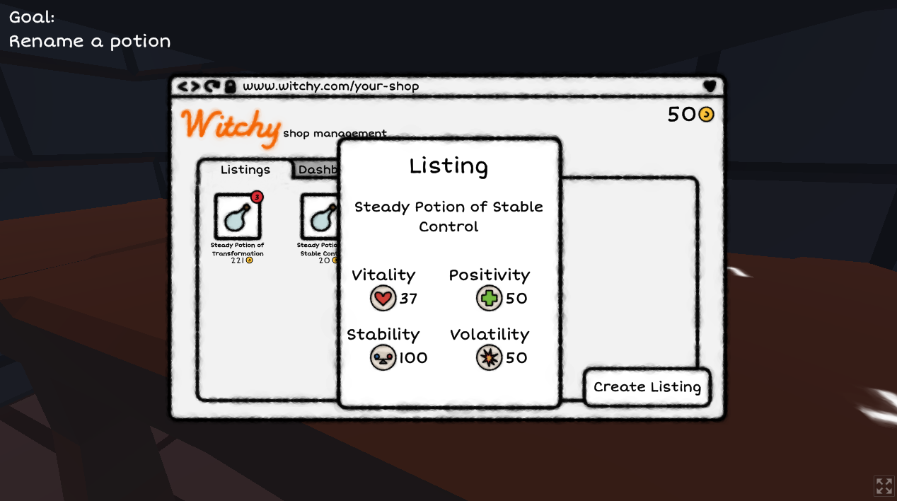 Nice game. I think I would've been lost without your notes on the page. It would've been more art to make, but having posters on the wall of actions would be cool. Kinda like how you had on the table where to sell potions. My game froze twice in the listings screen, so you might want to look into that, too. Otherwise, it was a fun and well-thought-out game. Great Job!