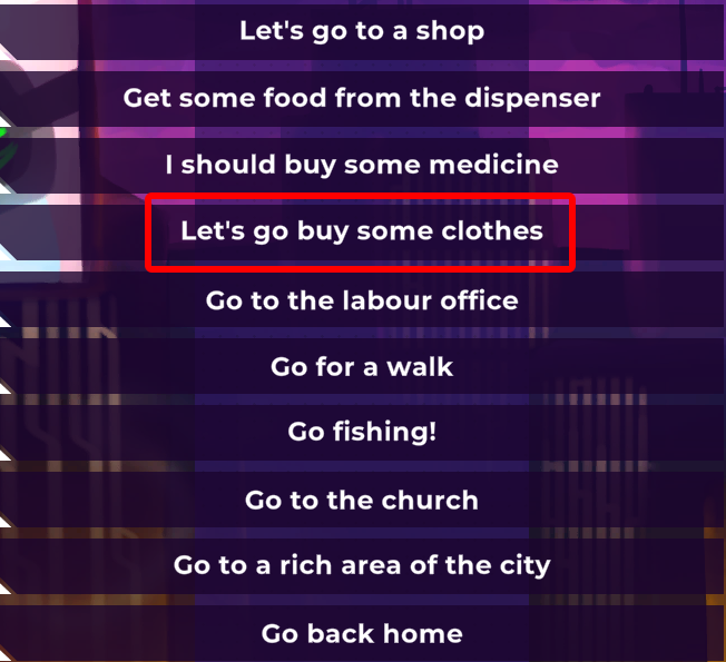 When you go for a walk, your sanity could decrease. Annalie will give you some food, the same as the labor office. The convenience & and Pharmacy are destroyed, you cannot get food or medicine during the event