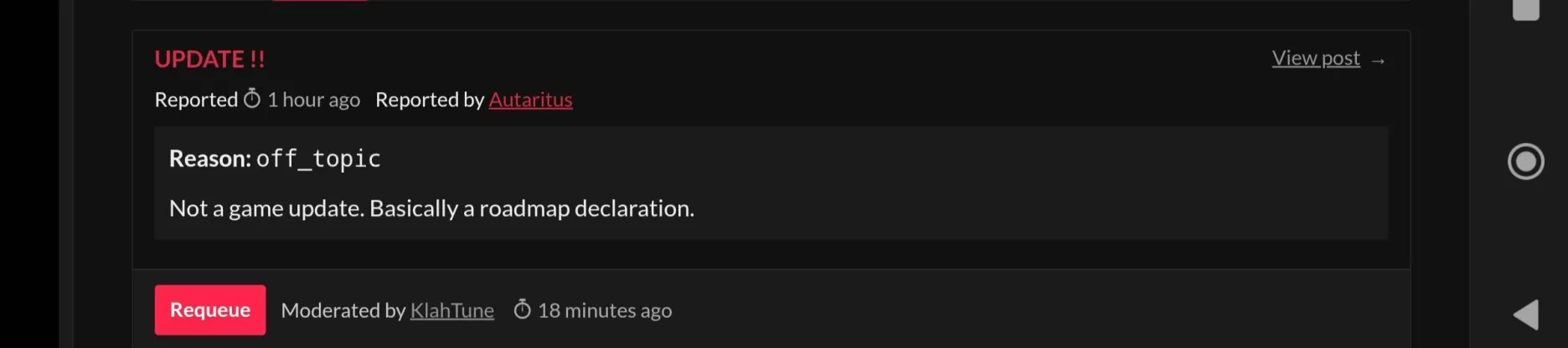 The original comment from @Autaritus was removed because it contained misinformation about the developer’s announcement and could mislead other players. The post I shared was an official statement from the main developer, not a game patch or gameplay update. It was a progress update and roadmap clarification directly from the source.