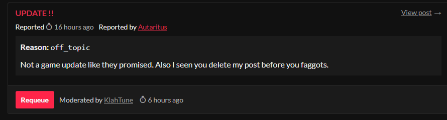 @Autaritus who posted the comment later edited their report to include a slur directed at either me or the developers. Hate speech and personal attacks are not allowed in this community. Because of that, the report was dismissed and appropriate action was taken.