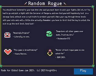 Thanks for the kind words! I agree there are plenty of things to improve in the game and I like the idea of enemies setting the woods on fire! Turn based rogue is certainly doable but I was going for an arcadey rogue mix, where movement is real time but combat is turn based. I haven't implemented combat mechanics or even the movement properly (the enemies move randomly) as this game was basically done in less than 24 hours for a game jam. But yep, it's on the TO DO list.