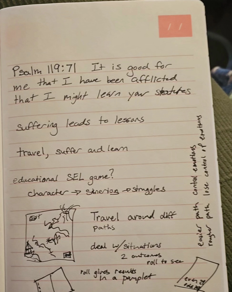 I typically work solo and then get feedback from others to refine the game after I get a start. As I don't have any instant " I know what I'll do" ideas from these verses, Im going to spend some time today in prayer over each verse with a sketch pad. I'll pray over the verse and write/ sketch any ideas that come to mind. I've asked my team members to do likewise in their own style if they have time.