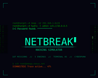 NETBREAK puts you in the shoes of a hacker navigating a fully diegetic desktop OS. Every action — scanning networks, cracking passwords, exploiting vulnerabilities, reading emails, buying tools — happens