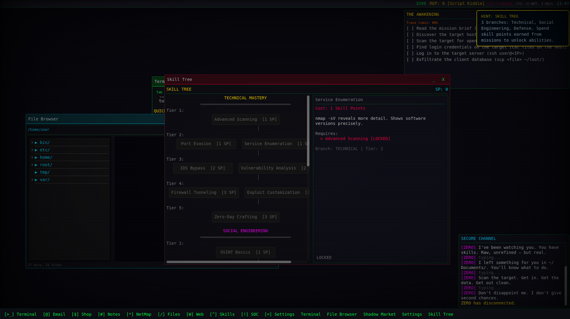 - 24-node skill tree (Technical, Social Engineering, Defense)