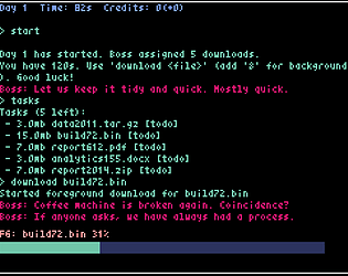 Race the clock in a snarky boss’s terminal: finish downloads, get paid, buy upgrades, repeat.