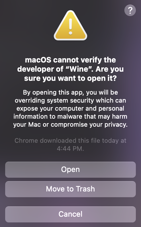 try re clicking it and it should allow you to open it, I just hope Wine is safe-