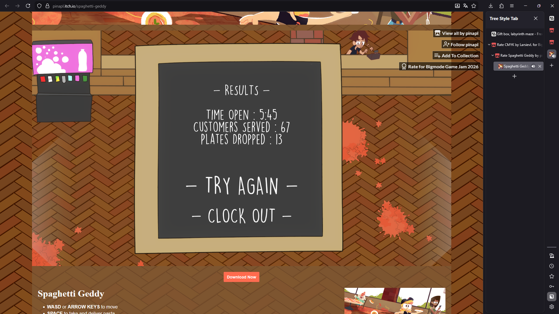 The ending noooo. The art of the little clown is adorable and the gameplay fits the theme very well. I did find the grappling hook kind of unpredictable and a reset button for the levels would also be a great addition, since I got semi-stuck on the level where you go back and forth with the bouncy balls. The art and music fit the game very well as well.