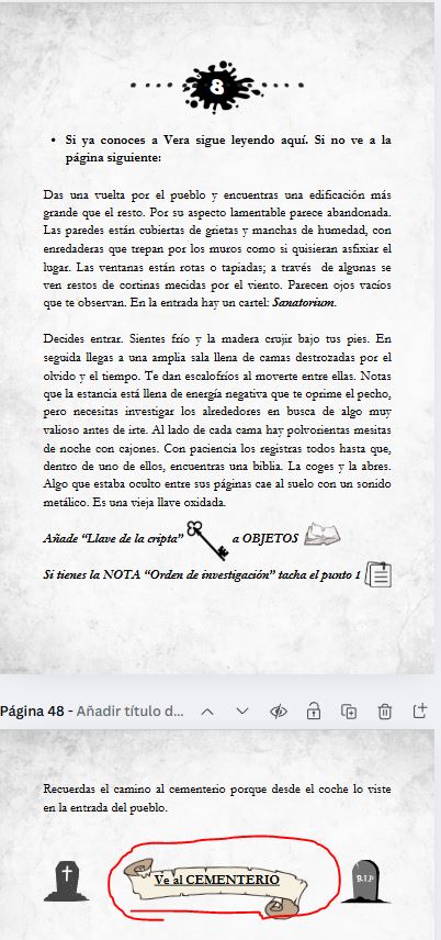 Gracias por la confirmación. En la sección 8 al final, donde pone "ve al cementerio" debería ser un link que te lleve a la página de la imagen del cementerio (donde pone El Cementerio arriba) y la siguiente página es donde se sigue leyendo (Todo en este pueblo...). Si está muy confuso puedo ponerlo de otra manera. Gracias por comentármelo
