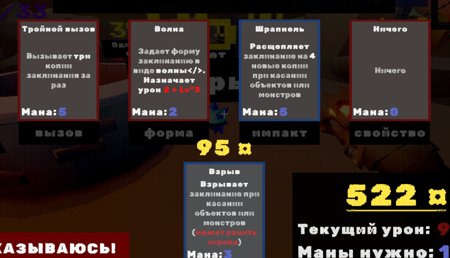 *Игра становится практически не играбельной если взять такой сет заклинаний (скрин). Я просто взрывался при стрельбе на месте, а был я на 3 уровне. Уж не знаю, задумано ли так изначально или нет, но пришлось выкручиваться. Решается это только стрельбой и нажатием кнопки назад, тогда ещё не коцает, иначе - сразу смерть (умер кстати я первый раз, когда прошёл 3й уровень полностью и попробовал выстрелить в воздух после апгрейда). А в условиях когда ты на платформе, такой манёвр вообще не возможен. Но в итоге как-то приспособился и дополз до этого колодца, что-бы снять апгрейды и поставить другие.