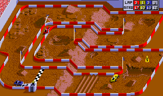 This reminds me of one of my favorite video games, Ivan "Ironman" Stewart's Super Off Road. You just need to add support for multiplayer, more tracks, and a track editor :)