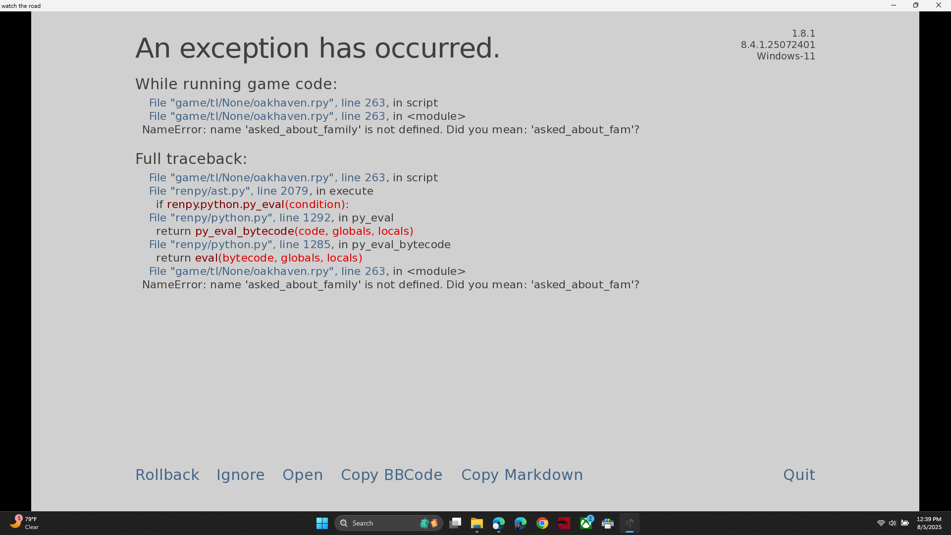 1/ sudden bug While I was playing and achieving what I deem as a 'good route' (I haven't achieved any ending for this yet, for reasons i'm about to explain) This error message suddenly popped up, and I couldn't figure out why it happened!